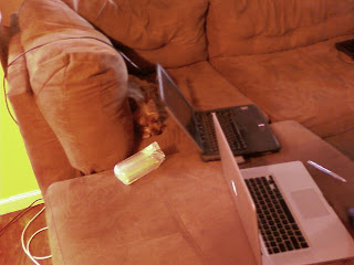 i couldn't find rosco the other morning. and he wouldn't come when i called. he was cleverly disguised on the brown couch, and was partially hidden by the computer screen and graham cracker package. sneaky dog.