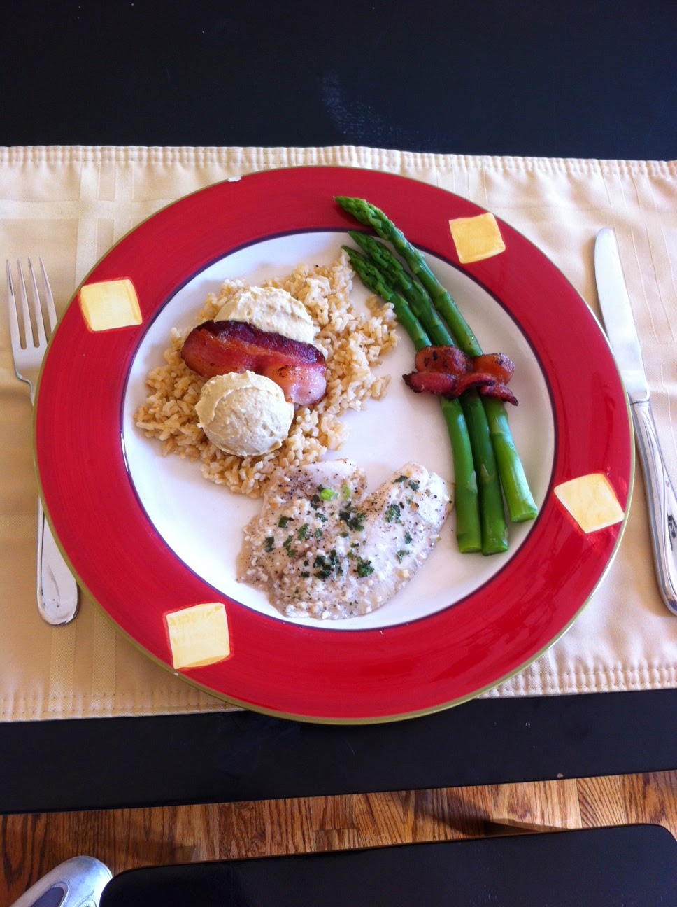 There is the rice. On top of that, there is garlic humus. And yes, yes, yes. Sitting atop that lovely combination is bacon. Bacon! And there's bacon on the asparagus, too! Oh yeah, there is meat there as well, which was also good.